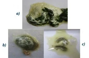 Urine and feces are excreted simultaneously in birds. In granivorous birds, the feces are thick, mushy to solid consistency. Color depends mainly on the type of feed and can vary from dark green, brown to black. On feces, as a rule, there is a deposit of whitish urine (Figure A).
